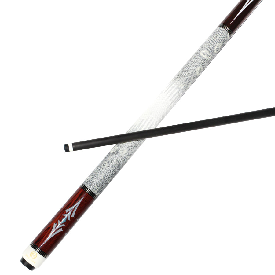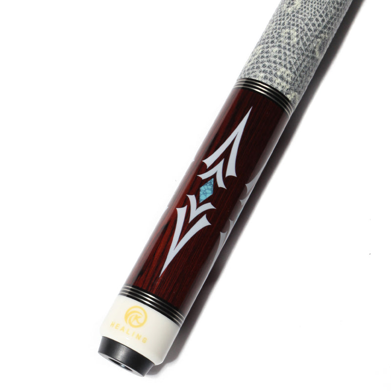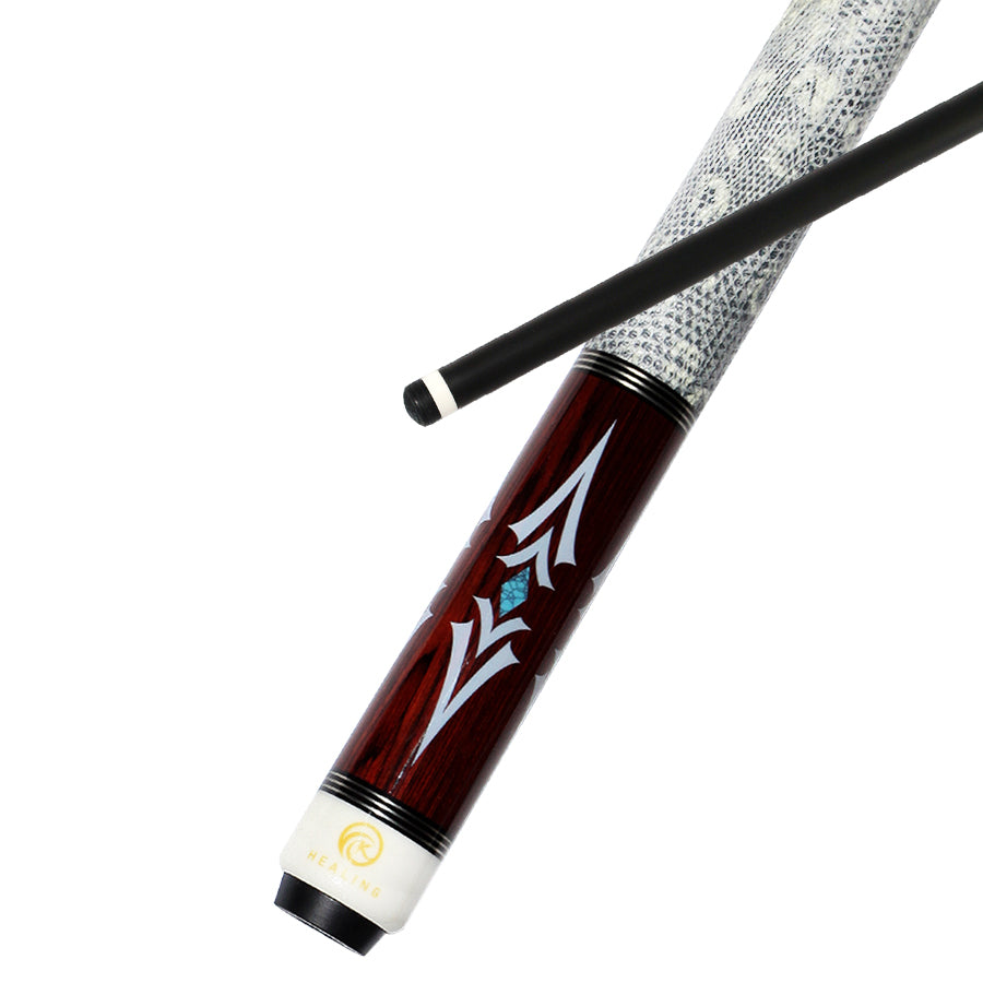 1. Reaktionsschnelles Queue-Griffstück: Verfügt über ein Hightech-Holzgriffstück für ein klassisches, reaktionsschnelles Spielgefühl , kombiniert mit mit einer weißen PU-Ummantelung im Eidechsenmuster für sicheren, rutschfesten Halt.