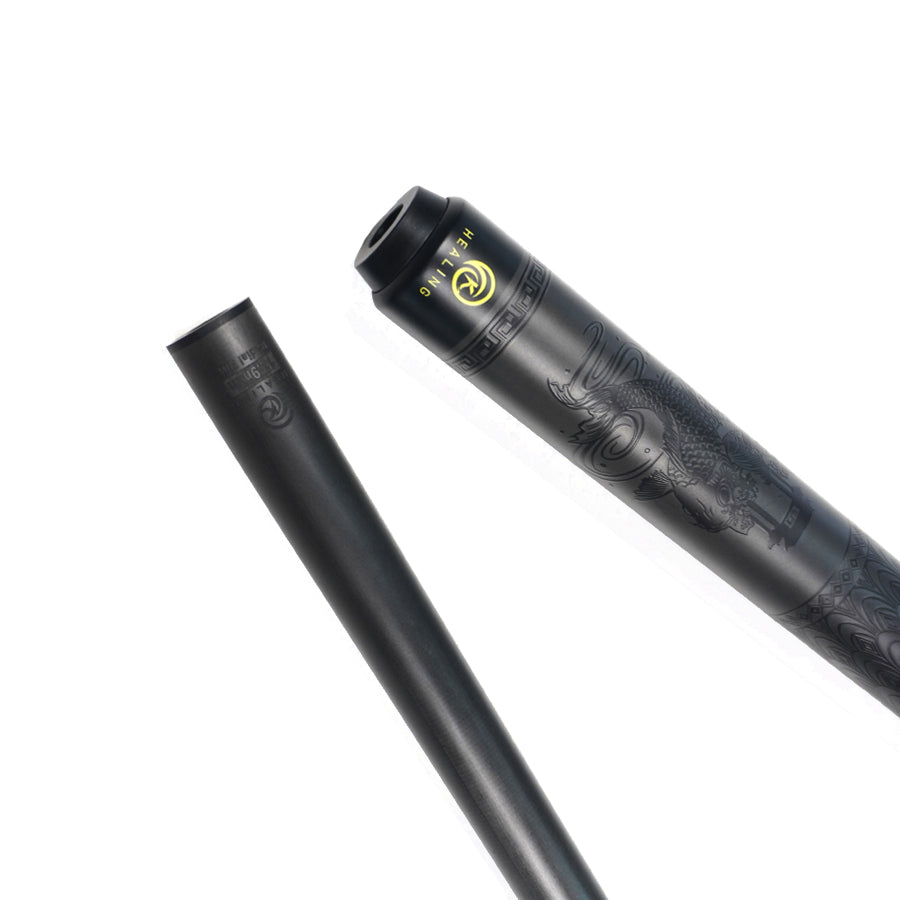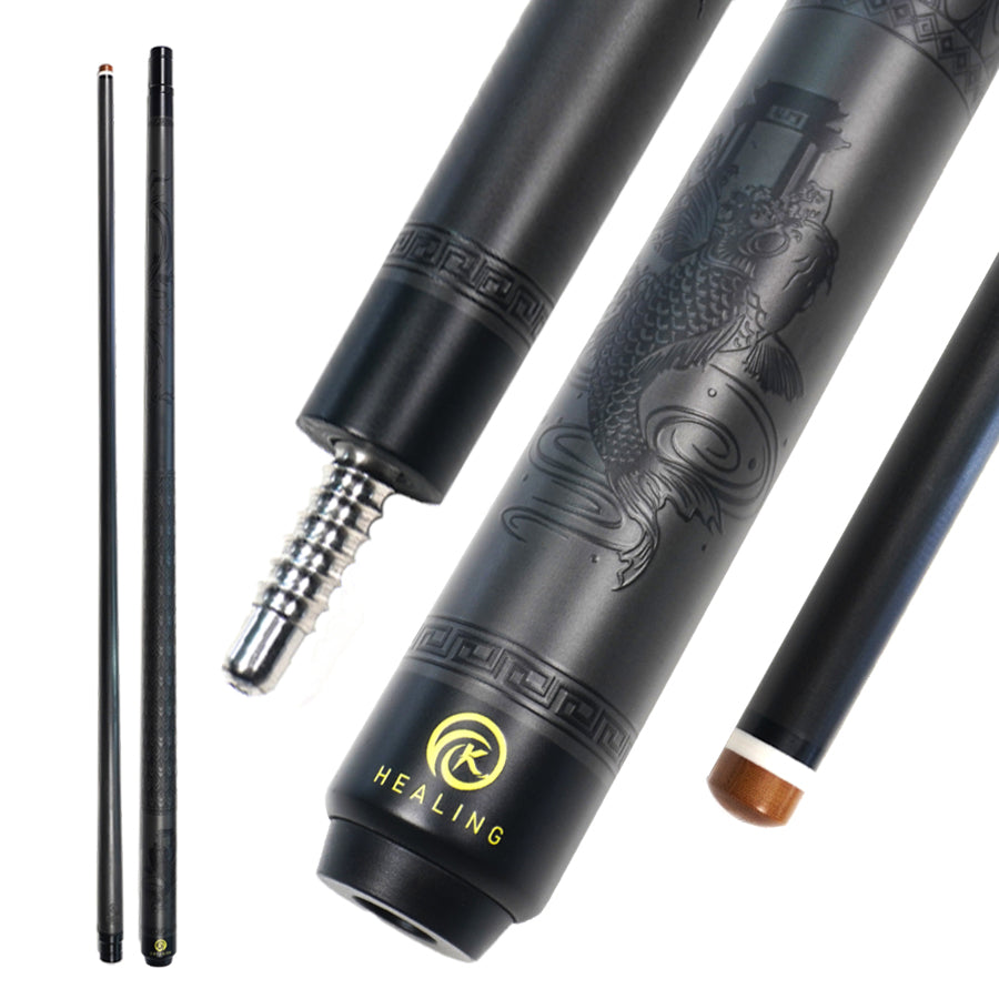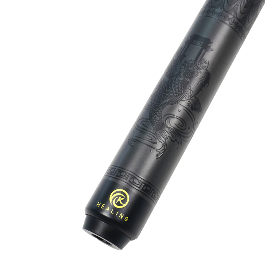 1.Carbon Fiber Cue Butt with a UD matte finish, featuring UV-printed, textured designs of a leaping carp and dragon motif that create a subtle 3D feel, symbolizing strength and success.